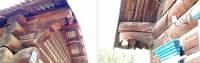 Для защиты торцов дома от осадков фронтальные свесы выдвигают далеко вперед за пределы сруба на двух или трех выпускных бревнах с фигурными очертаниями.